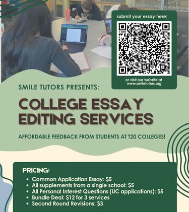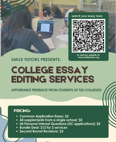 Need your essays checked to see if they're college-ready? No worries, we got you! Smile Tutors is offering editing services from students with successful applications to colleges around the nation. To sign up, click here.
